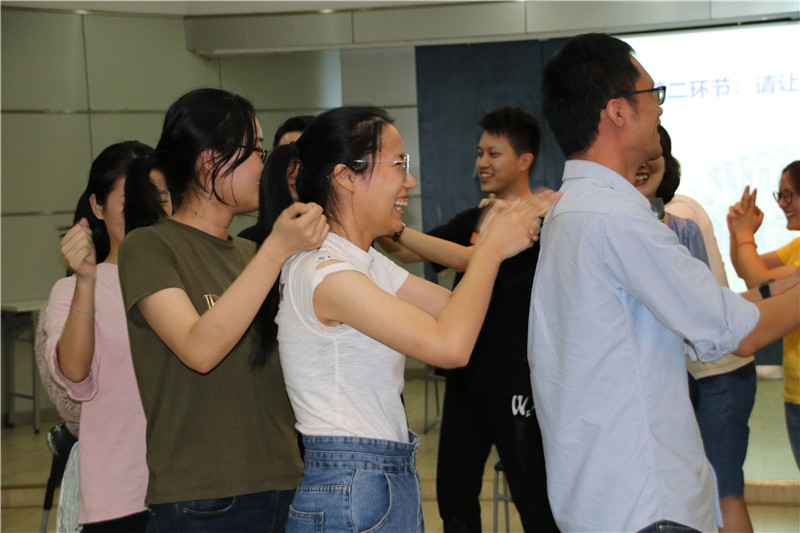 活動(dòng)在勵(lì)志歌曲“追夢赤子心”的音樂聲中拉開序幕。大家在指導(dǎo)老師的引領(lǐng)下,分成二個(gè)小組共同進(jìn)入“大風(fēng)吹”“請(qǐng)讓我為你按摩一下下”“優(yōu)點(diǎn)轟炸”“銜紙杯傳水”
